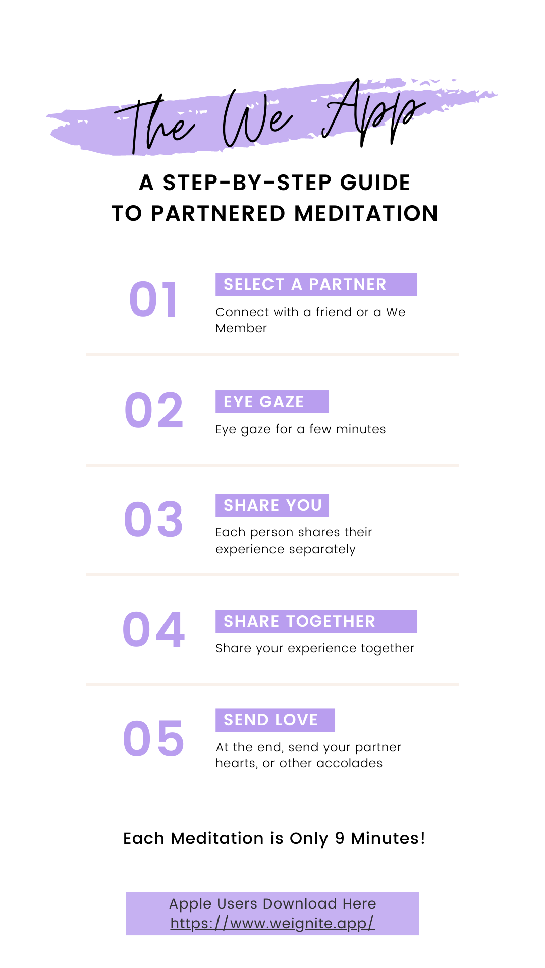 Whether you love meditation or just love people, you’ll love this new way of connecting through We App. It provides you with a structured way to connect with another person through an eyes-open meditation that uses both silence and words to bring you together inside the present moment.